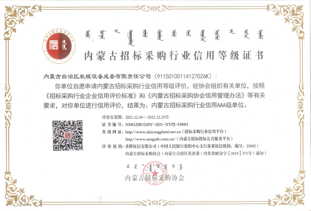 內(nèi)蒙古招標采購行業(yè)信用AAA級單位資格證書